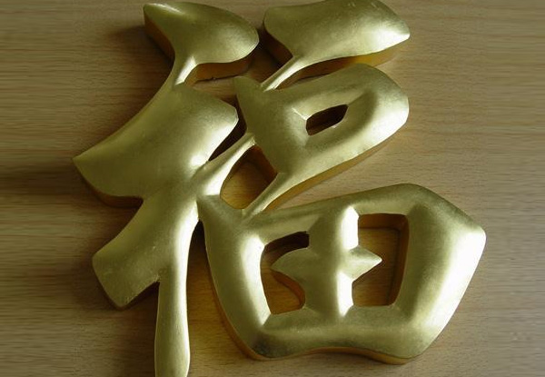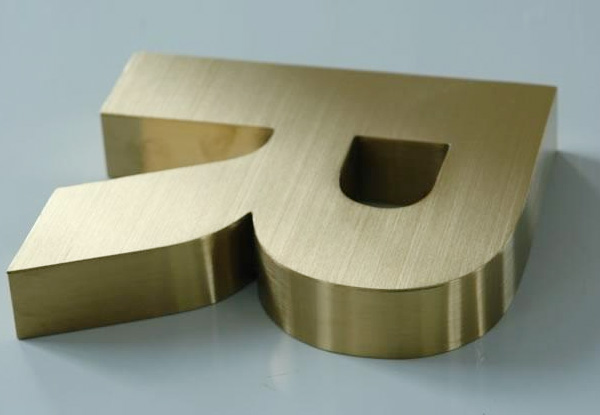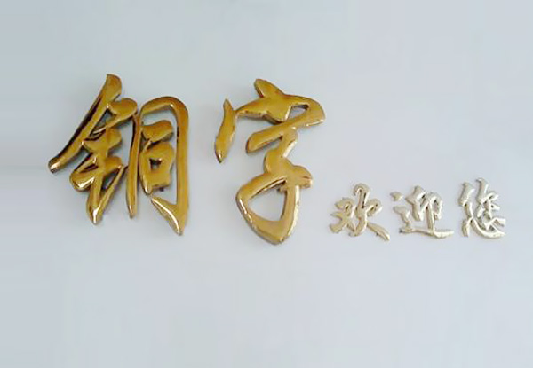銅字不易生銹,它的顏色只有一種,即金黃色,給人感覺富麗堂皇、很威嚴。許多政府單位用得多,像外樓的字、門牌、行政牌等。銅,亦是較易氧化的金屬,因此常將它進行電鍍或完成字形加工后將表面拋光處理,再做封閉漆(防銹),使其金光閃閃,凸顯出來的效果更好。